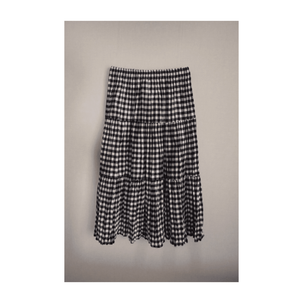 コットンフランネルのティアードスカートで、Black Watchチェック柄が印象的。三段切り替えのフレアシルエットで、日常を上品に彩ります。