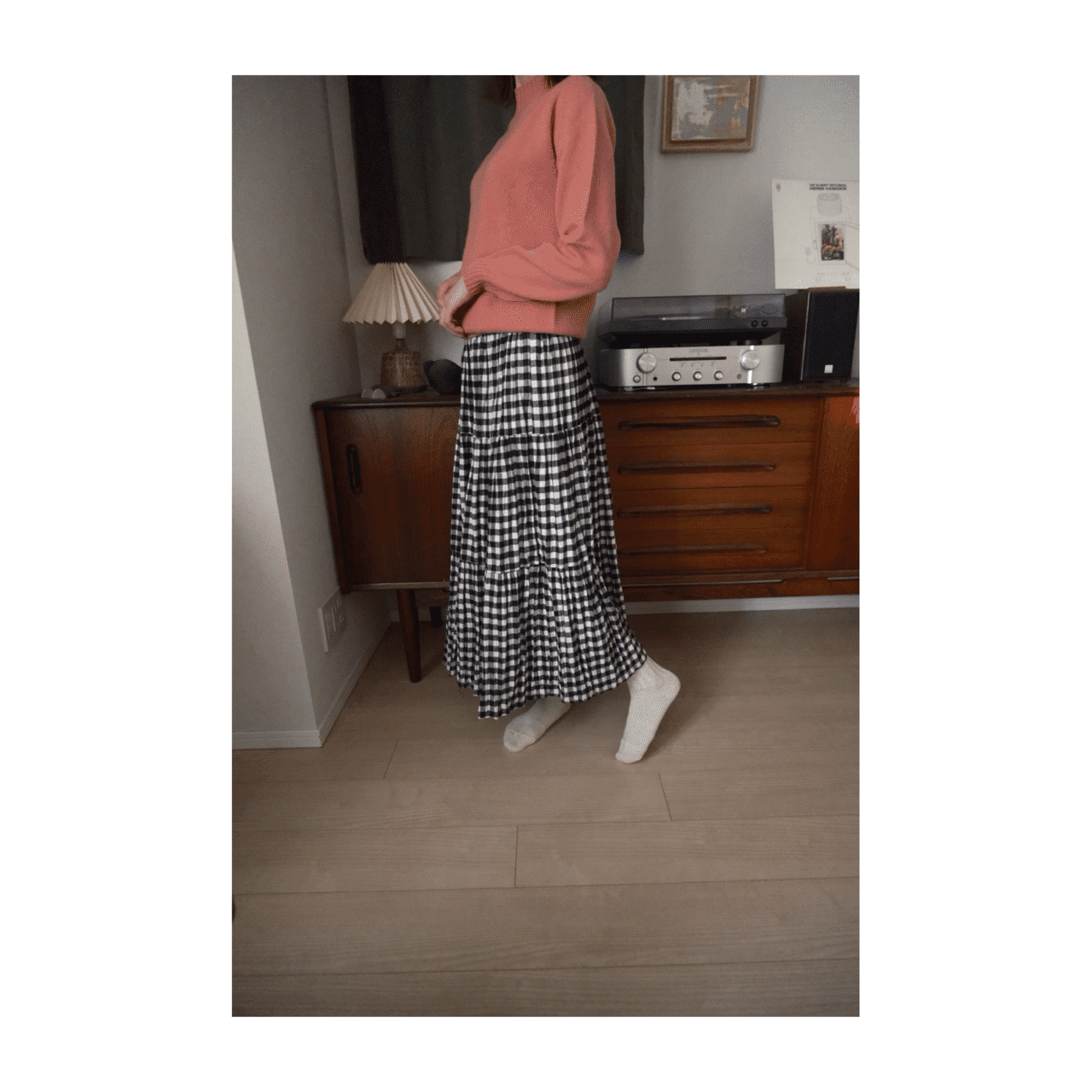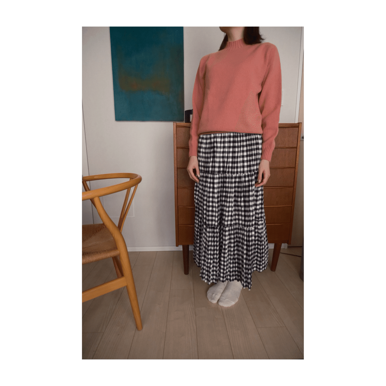 無地トップスと好相性のブラックウォッチ柄