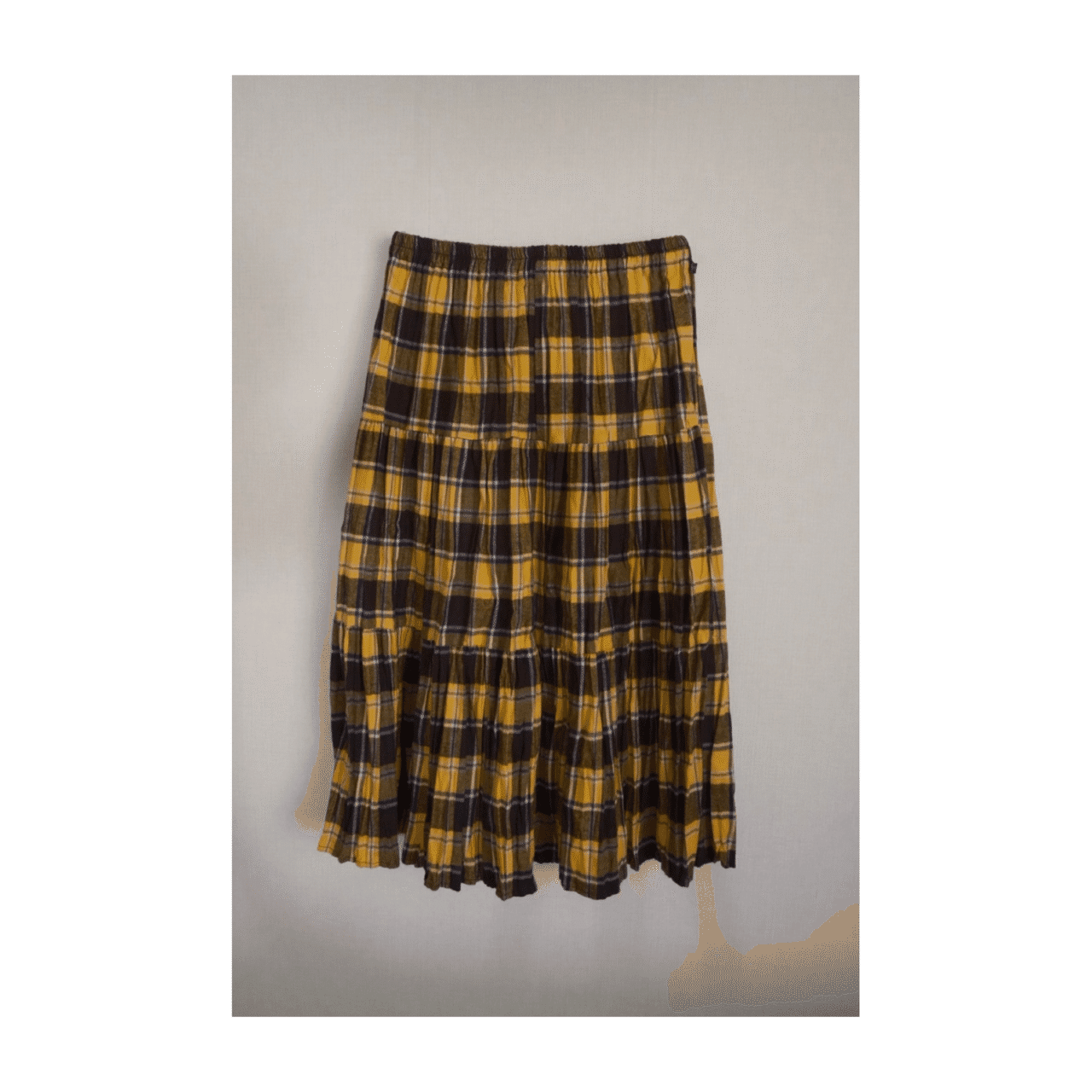 コットンフランネルのティアードスカートで、Yellow/Navyチェック柄が印象的。三段切り替えのフレアシルエットで、日常を上品に彩ります。
