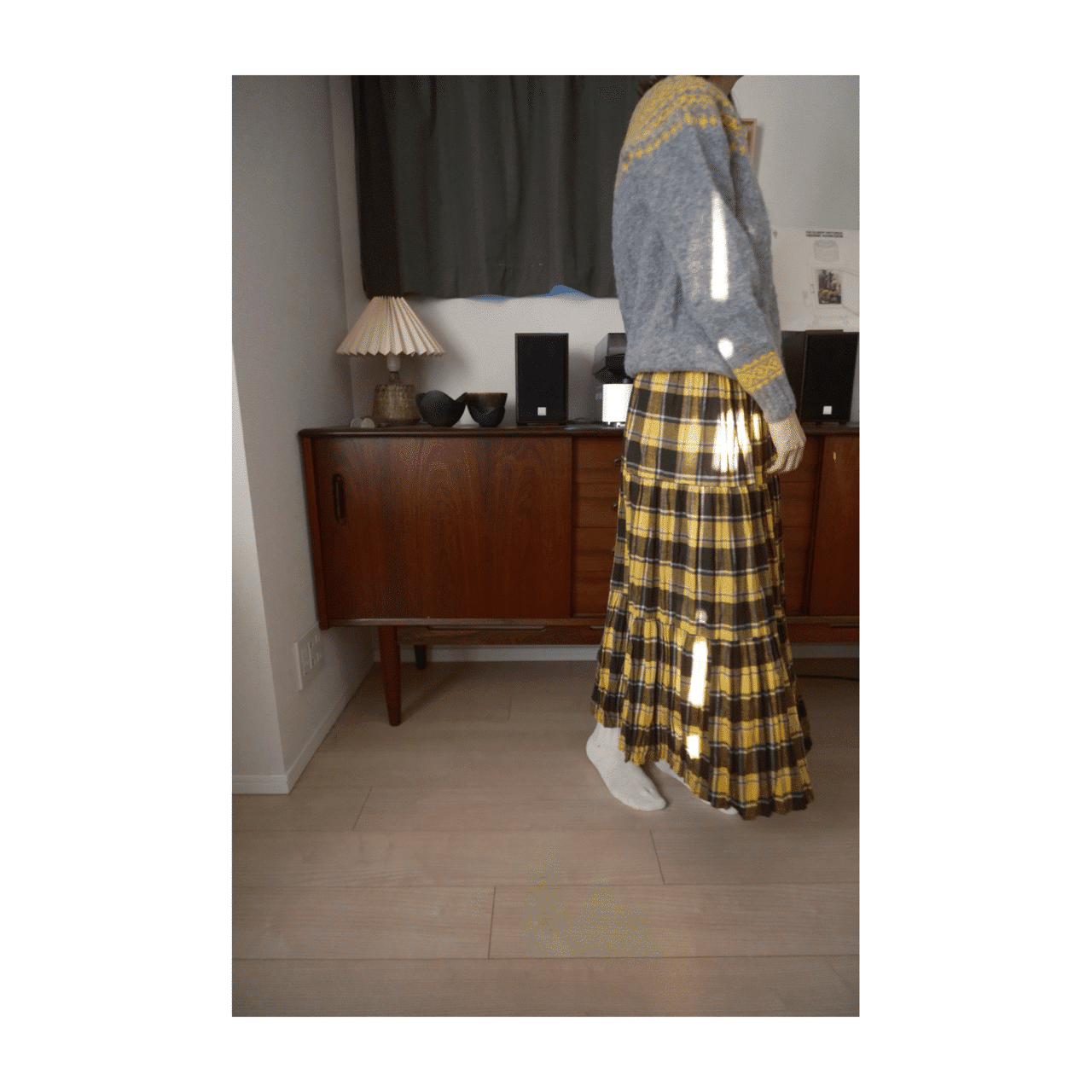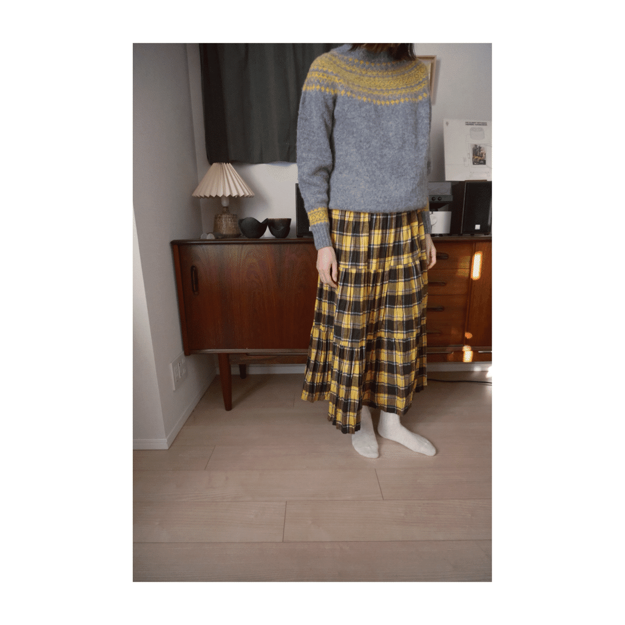 グレー×サンシャインとイエローネイビーチェックのコーディネートで、冬を彩るスタイルをご提案します。