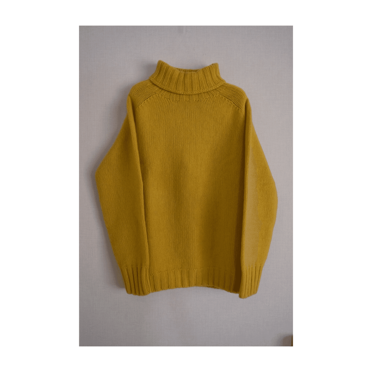 発色のよいイエローが装いの主役になるタートルネック。6プライのローゲージとラムウール100%で、冬の日常に頼れる一枚です。
